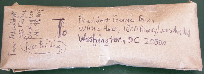 I'm mailing some rice on Monday. Feel free to pass this along. > Subject: [Fw: Rice for dubya] > Date: Fri, 31 Jan 2003 08:10:02 -0500 > > There is a grassroots campaign underway to protest war in Iraq > in a simple, but potentially powerful way. > > Place 1/2 cup uncooked rice in a small plastic bag. Squeeze out > excess air and seal the bag. Wrap it in a piece of paper on which > you have written, "If your enemies are hungry, feed them. Romans12:20. > Please send this rice to the people of Iraq; do not attack them." > > Place the paper and bag of rice in an envelope (either a letter-sized > or padded mailing envelope--both are the same cost to mail) and > address them to: > > President George W. Bush > White House, 1600 Pennsylvania Ave. NW > Washington, DC 20500 > > Attach $1.06 in postage. (Three 37-cent stamps equal $1.11.) > > Drop this in the mail TODAY. It is important to act NOW so that > President Bush gets the letters ASAP. In order for this protest > to be effective, there must be hundreds of thousands of such rice > deliveries to the White House. We can do this if you each forward > this message to your friends and family. > > There is a positive history of this protest! Read on: > > "In the mid-1950s, the pacifist Fellowship of Reconciliation, > learning of famine in the Chinese mainland, launched a 'Feed Thine > Enemy' campaign. Members and friends mailed thousands of little >bags of rice to > the White House with a tag quoting the Bible, "If thine enemy hunger, feed > him." As far as anyone knew for more than ten years, the campaign was > an abject failure. The President did not acknowledge receipt of the bags > publicly; certainly, no rice was ever sent to China. > "What nonviolent activists only learned a decade later was that the > campaign played a significant, perhaps even determining role in > preventing nuclear war. Twice while the campaign was on, President > Eisenhower met with the Joint Chiefs of Staff to consider U.S. > options in the conflict with China over two islands, Quemoy and Matsu. > The generals twice recommended the use of nuclear weapons. President > Eisenhower each time turned to his aide and asked how many little >bags of rice > had > come in. > > When told they numbered in the tens of thousands, Eisenhower told > the generals that as long as so many Americans were expressing active > interest in having the U.S. feed the Chinese, he certainly wasn't going > consider using nuclear weapons against them." > > From: People Power: Applying Nonviolence Theory by David H.Albert, > p. 43, New Society, 19. > > Thank you for being people of hope, people of faith. |