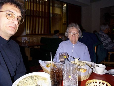 7:15 pm. Dinner. Eating Italian at Victoria's Restaurant. Patient has Cheese Tortallini Soup, Fettucine Alfredo, and garlic bread (assistant takes picture by holding camera at arms length). Walk back one-block to hotel.