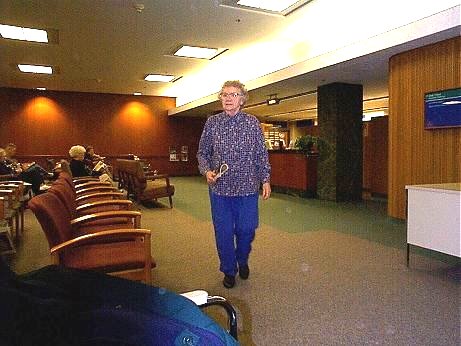 12:10 pm. After getting our name at the bottom of the list, we begin waiting around the MRI wait-list desk to see if anything opens up. Patient has decided to get some exercise by walking over to the magazine rack and back.
