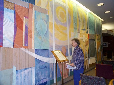 1:00 pm. Patient studies the mural, "Man and the Energies" by William Saltzman, near the MRI wait-list desk.