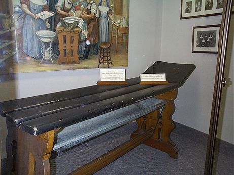 2:40 pm. Patient and assistant visit tiny room museum in St. Mary's displaying the innovative operating table (with galvanized blood trough) designed by the Mayo brothers.