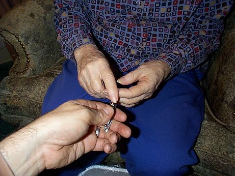 Clipping the long finger nail on Mom's right hand index finger, the finger she needs to use to carefully insert the suppository.