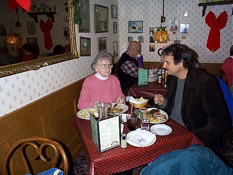 7:45 pm. Patient and assistant return to Henry Wellington for a celebratory dinner. Patient enjoys warm French bread, a tossed salad, juicy pork medallions with apple sauce, garlic mashed potatoes, and water.